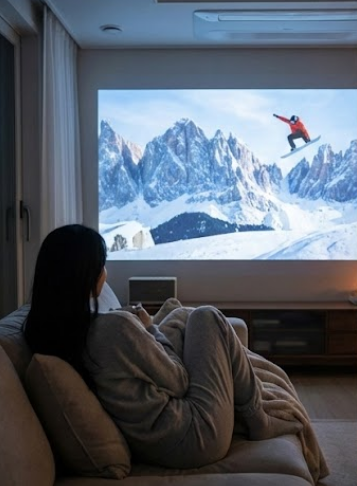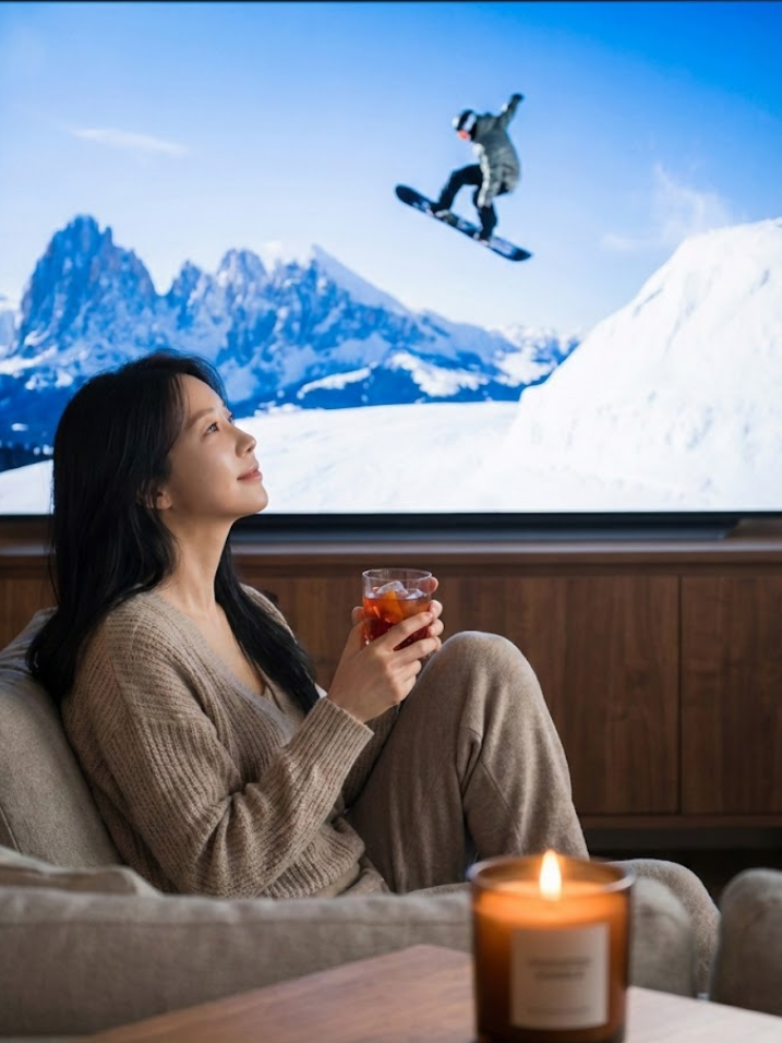 음악과 맛이 준비되었다면 이제 시각적 전율을 더할 차례입니다. 거실 스크린에 코르티나 담페초의 웅장한 돌로미티 산맥을 띄웁니다.