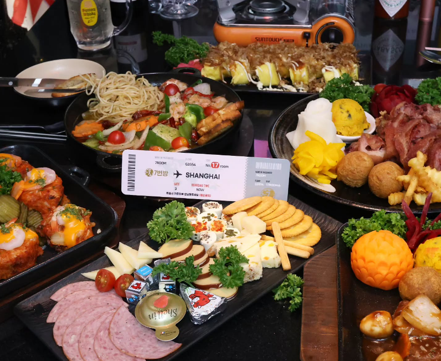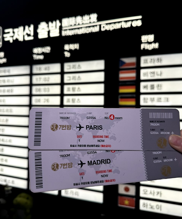 '7번방 방이점'은 방이동 먹자골목에 위치한 프라이빗 룸포차로, 각 방이 세계 도시를 테마로 꾸며져 있어 이색적인 분위기를 제공합니다. 엘리베이터를 통해 3층으로 올라가면, 카운터에서 룸 키를 받아 입장하는 방식으로 운영됩니다. 룸 키는 비행기 티켓처럼 디자인되어 있어 여행을 떠나는 듯한 설렘을 느낄 수 있습니다.