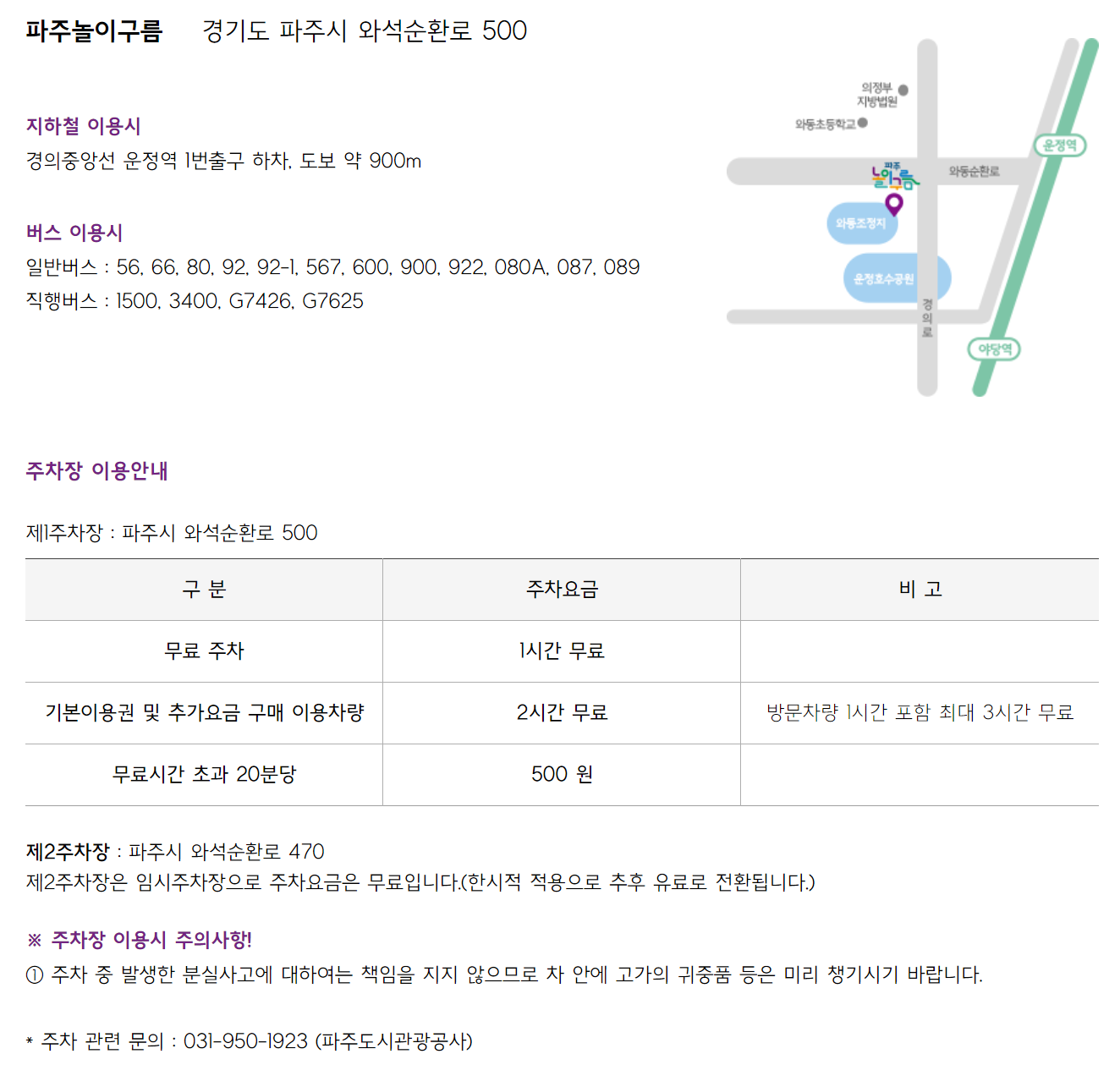 주차는 놀이구름 근처에 마련된 전용 주차장을 이용할 수 있습니다. 주차 공간이 넉넉하긴 하지만, 주말에는 혼잡할 수 있으니 대중교통을 이용하는 것도 고려해보세요. 특히, 파주 놀이구름은 대중교통으로도 접근이 용이하니, 아이들과 함께 편리하게 이동할 수 있습니다. 주차 요금은 무료이니, 주차 걱정 없이 즐거운 시간을 보내세요!