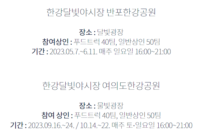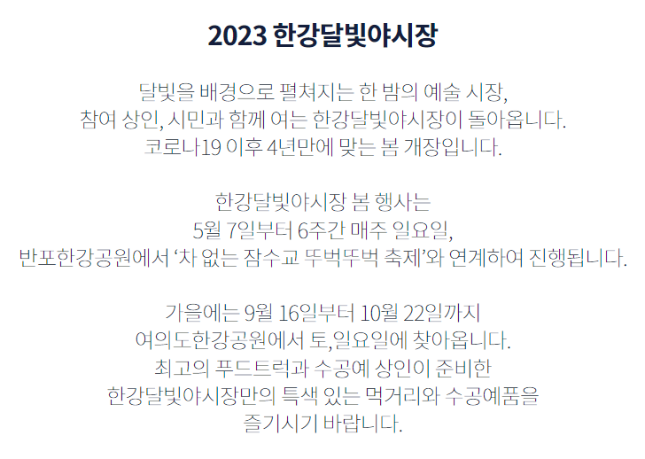 한강달빛 야시장 축제는 2023년 9월 16일 시작하여 10월 22일까지 매주 주말 열리는 서울형 야시장입니다. 해외여행을 가보면 야시장 문화가 정말 잘 되어있는 태국이나 베트남 같은 곳에서 야시장의 낭만을 느끼실 수 있는데요. 그러한 야시장 남부럽지 않게 다리를 끼고 펼쳐지는 한강 야시장은 올해 특히 더 특별합니다.