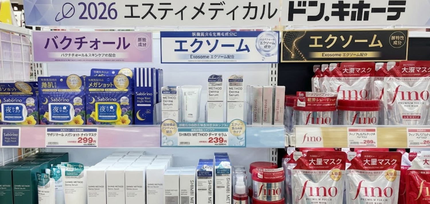 과거의 돈키호테가 가성비 위주의 드럭스토어 제품에 집중했다면, 2026년의 돈키호테는 '고기능성 성분'에 진심입니다. 최근 일본 뷰티 업계를 뒤흔든 핵심 성분인 바쿠치올(Bakuchiol)과 엑소좀 함유 제품들이 매대 전면을 장식하고 있습니다.
